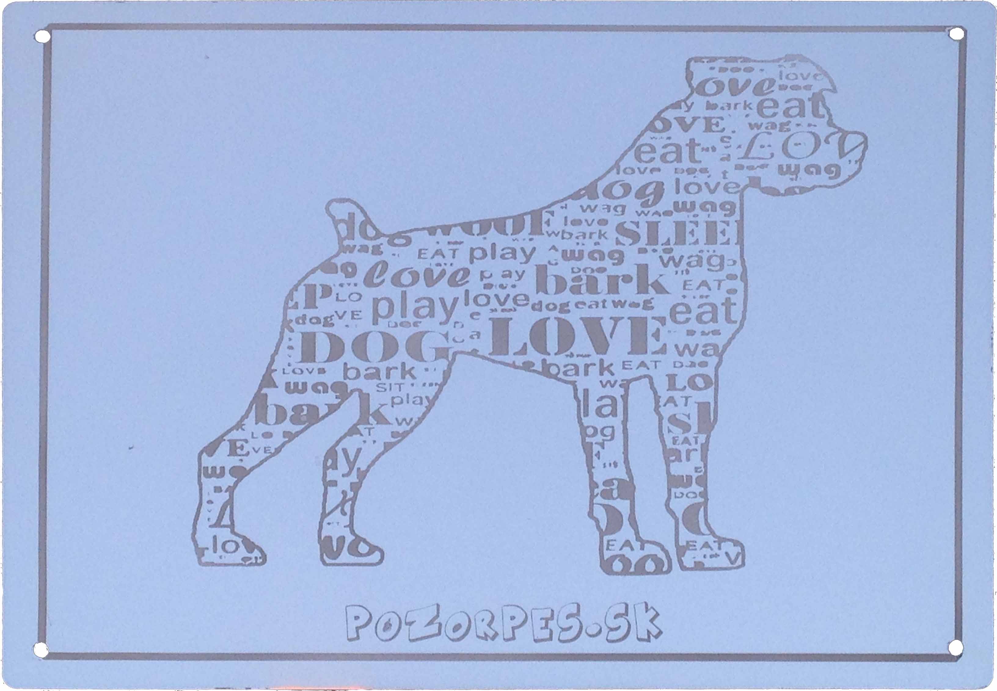 Pozorpes.sk, výstražná tabuľka nerezová pieskovaná. Ručne vyrábaná tabuľku, z nerezového plechu, hrúbky 1mm, ktorá nehrdzavie a je odolná vonkajším poveternostným vplyvom. Pieskovaním, sa leštený povch materiálu zdrnsní a vytvorí elegantnú siluétu psíka.